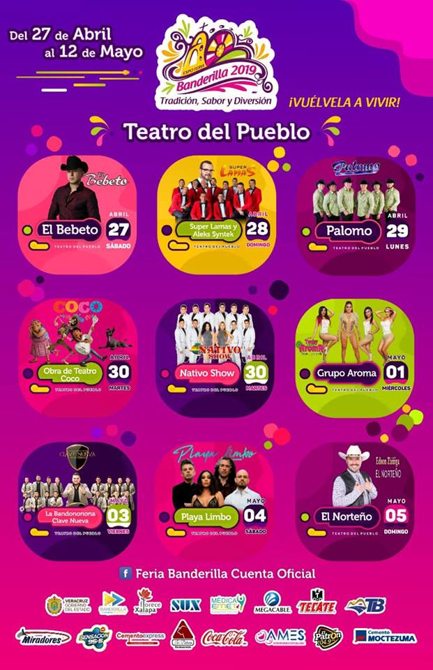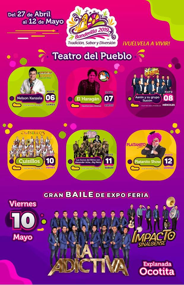 El elenco artístico que se presentará en la Expo Feria es el siguiente: 28 de Abril – Los Súper Lamas & Aleks Syntek 29 de Abril – Palomo 30 de Abril – Nativo Show 1 de Mayo – Aroma 3 de Mayo – Bandononona Clave Nueva 4 de Mayo – Playa Limbo 5 de Mayo – El Norteño 6 de Mayo – Nelson Kanzela 7 de Mayo – El Haragán 8 de Mayo – Aarón y su Grupo Ilusión 10 de Mayo – Banda Cuisillos 11 de Mayo – Los Socios del Ritmo con Alexander Acha y Big Metra 12 de Mayo – Platanito Show